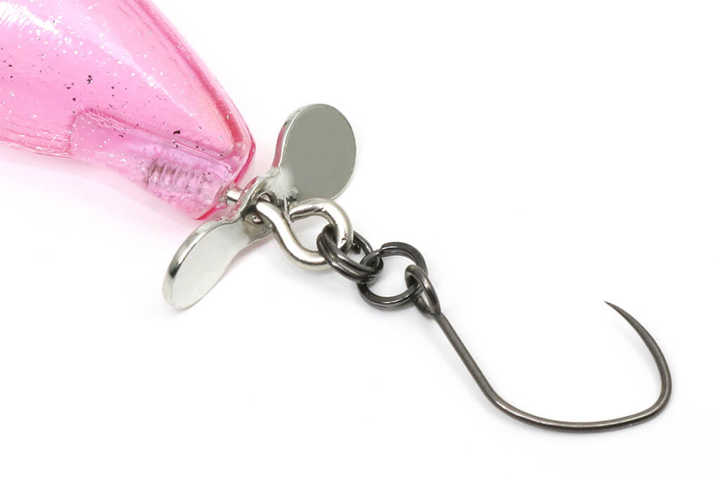Die zentrale Öse besitzt ein leichtes Spiel, wodurch der Propeller schneller greift und sofort Bewegung erzeugt. Zusätzlich kann ein kratzendes Geräusch entstehen, wenn der Propeller den hinteren Haken berührt – ein weiterer Reiz für räuberische Forellen.